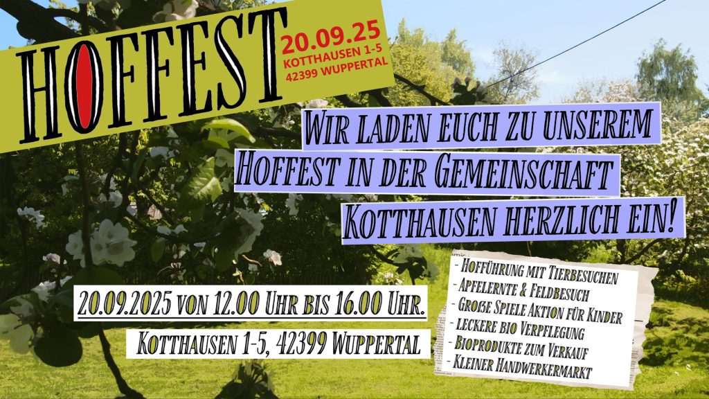 Ihr könnt euch über den Hof führen lassen und erfahren wie es sich in Gemeinschaft lebt und was Hof Kotthausen ausmacht. Es gibt leckere Essensstände mit frisch zubereitetem Bioessen und kleine Stände mit Hofprodukten und schönen Dingen.